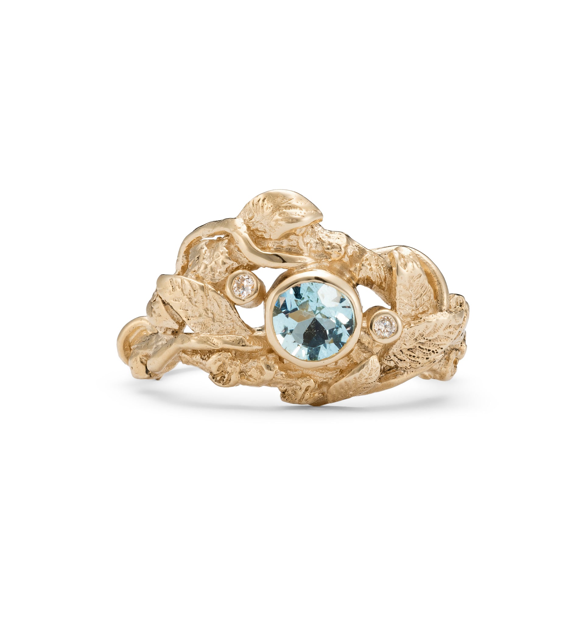 This breathtaking nine carat gold woodland-inspired ring is a true showstopper, blending elegance with natural charm. Featuring a sky blue aquamarine and sparkling diamonds, it’s perfect for anyone looking for a unique and timeless design. The showcased ring is a size O, but it can be made to order with stones of your choice for a truly personalized piece.